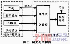 网关的设计包括2个部分,即无线通信模块和辅助功能模块。其中无线通信模块是这个网关的核心部分,负责跟基站、电子标签以及参考节点等之间进行通信。辅助功能模块是完成定位串口通信、状态指示、LCD的显示、供电等辅助功能。网关的结构框图如图2所示。