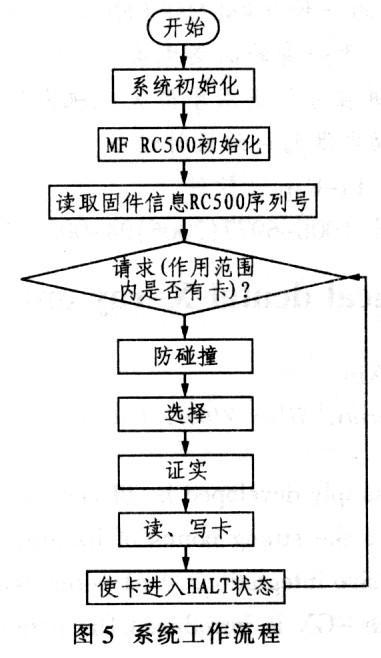 当对应的。RFlD卡S50进入阅读器的有效范围时,天线的能量使 RFID卡耦合出自身工作的能量,并建立通信。MF RC500对卡的操作主要是通过写通讯命令、参数和数据到FIFODATA,再通过写命令到120MMAND,实现与RFID卡的通讯。系统工作流程如图 5所示。